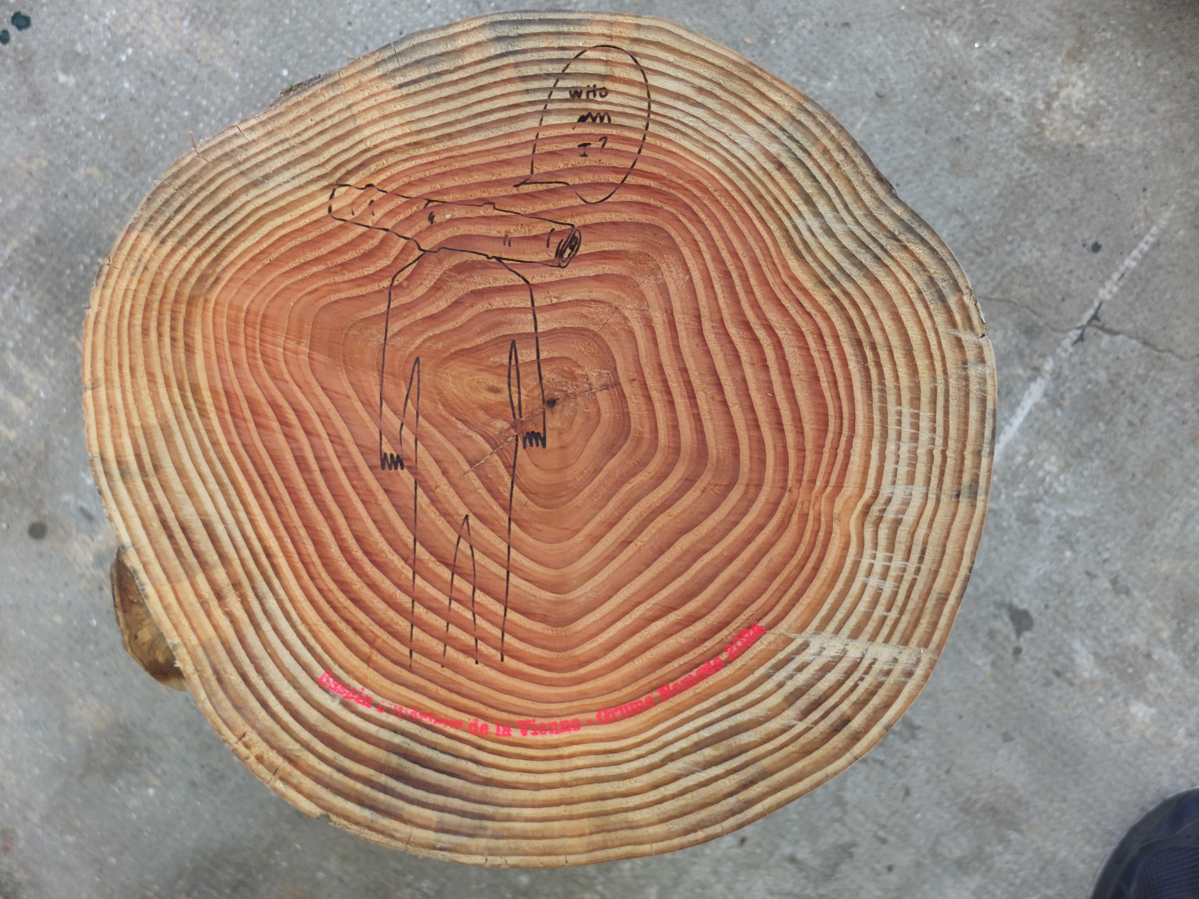 Un voyage depuis les sources de la Vienne jusqu'à Limoges. Une réflexion sur les forêts de la montagne limousine et sur la Vienne. Une histoire de territoires pluriels et complexes, à travers la marche, l’observation et la rencontre. De tout cela nous vient l'idée de fournir un outil mobile de rencontre, afin que les discussions déjà foisonnantes puissent se perpétuer. Ce billon, découpé en rondelles, poncé, décoré puis assemblé en tabouret devient alors un témoin de la source, de cette partie supérieure où l'eau s'accumule et s'accélère dans un univers de hêtraies centenaires et de pin douglas planté comme du blé et fauché sans vergogne.