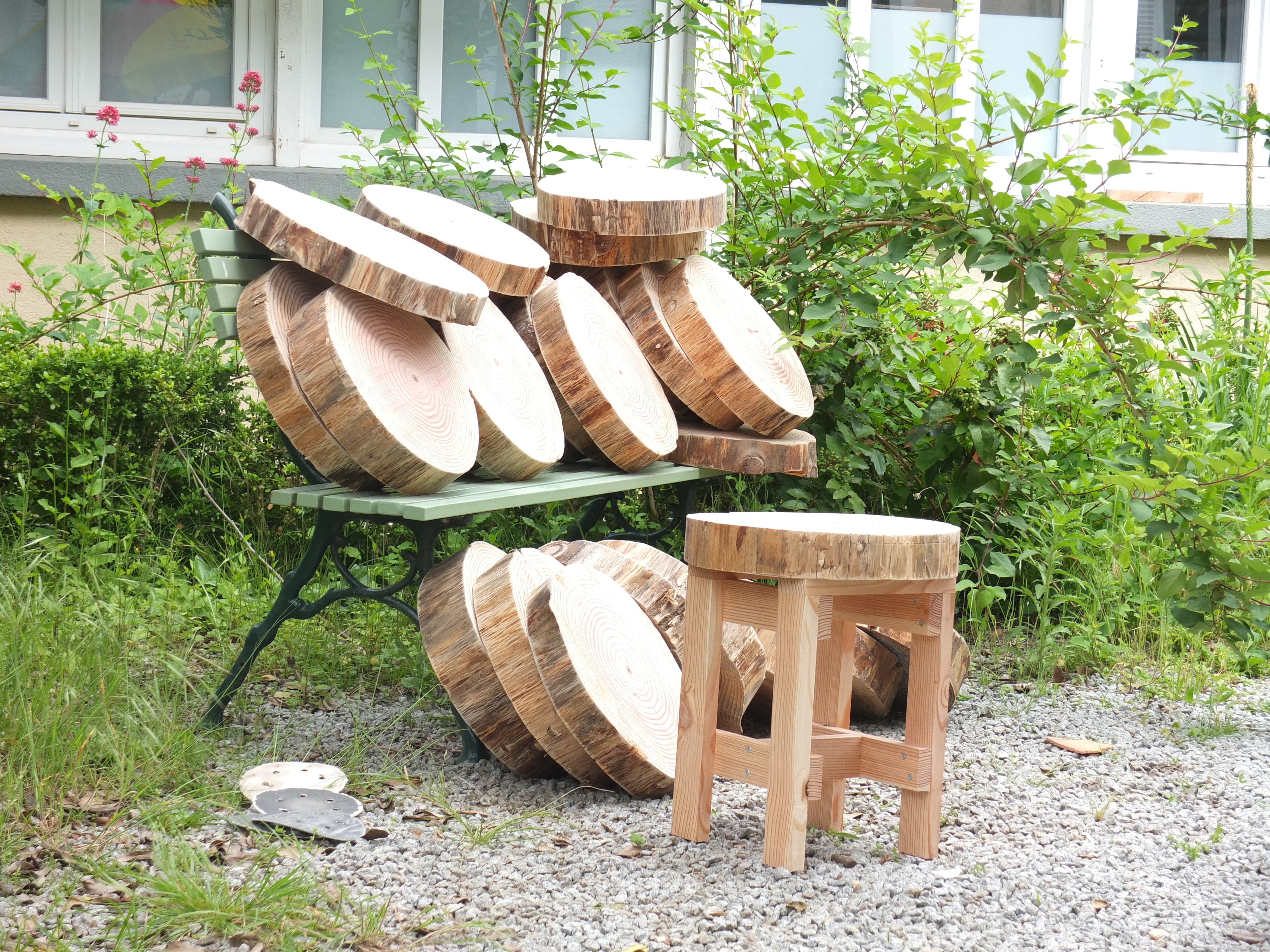 Une autre donnée est évidemment celle de la sylviculture intensive du plateau, visible jusqu'aux panneaux du PNR, renommé parc industriel régional par de facétieuses tagueureuses à chaque entrée de ville. Coupes-rases facteurs de pollutions à l'aluminium, intrants chimiques, espèces invasives, sol acide et fin de la cueillette des champignons. Mais aussi synonyme d'emploi dans le territoire le moins doté de Nouvelle-Aquitaine. De tout cela nous vient l'idée de fournir un outil mobile de rencontre, afin que les discussions déjà foisonnantes puissent se perpétuer. Ce billon, découpé en rondelle, poncé, décoré puis assemblé en tabouret devient alors un témoin de la source, de cette partie supérieure où l'eau s'accumule et s'accélère dans un univers de hêtraies centenaires et de pin douglas planté comme du blé et fauché sans vergogne.