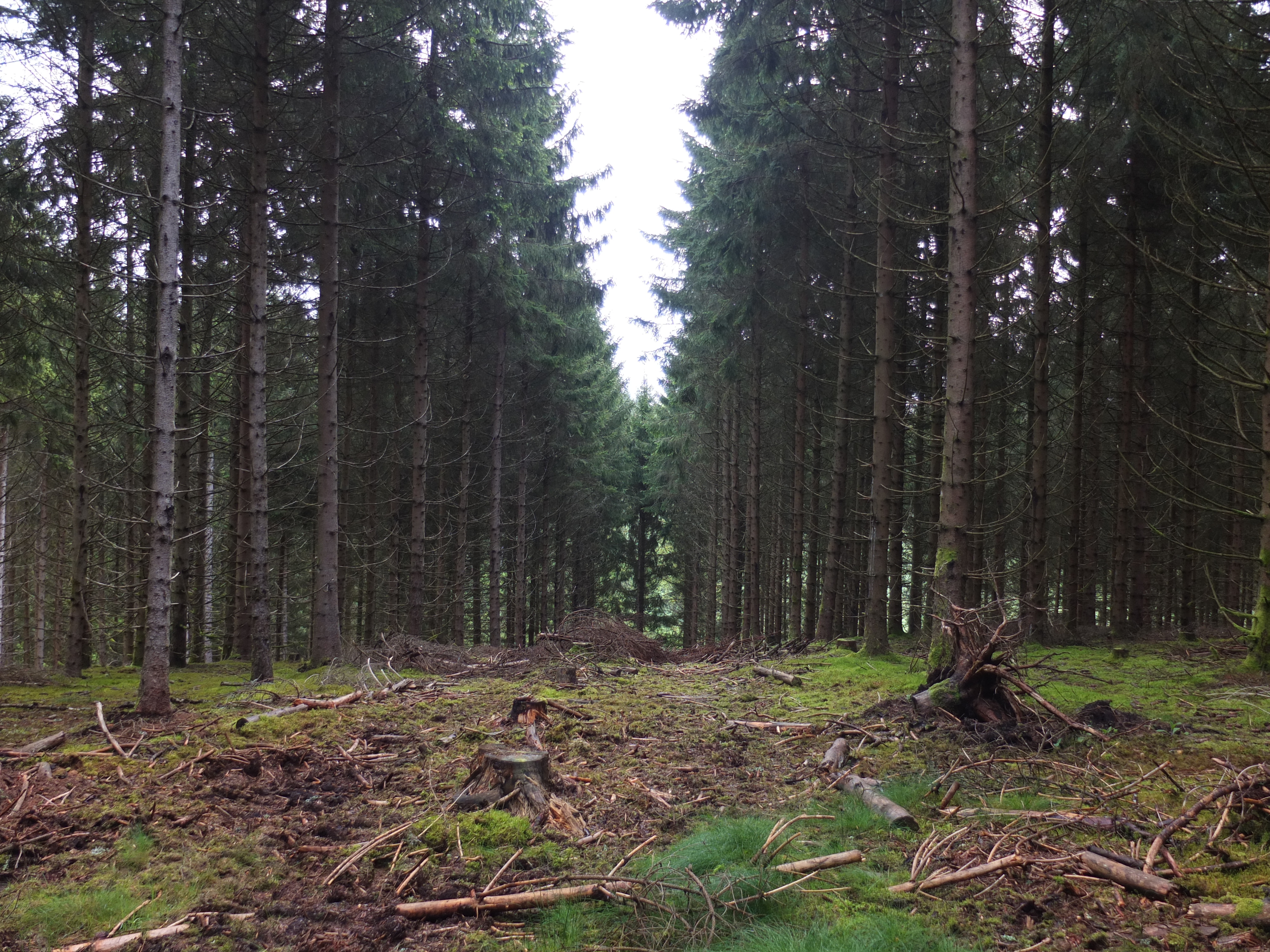 Le fond de la rivière est ocré, pour ne pas dire marronnasse, mais son débit important, -en ces temps pluvieux- lui offre une prestance particulière. Elle longe rapidement une ripisylve variée et dense de faune selon les panneaux du parc : loutres luisantes, poissons dodus, tiques piquantes et chevreuils aboyants. Un gars dira plus tard que les tiques et leurs maladies ne sont qu'un rappel aux humains- humaine.s que nous ne sommes pas toustes puissant-puissante.s dans la forêt. Mais nous aurions tord de nous arrêter sur les paysages enchanteurs longeant l'eau : les alentours immédiats sont dévastés. Nous vient les images du Mordor, le gris sec des coupes rases.