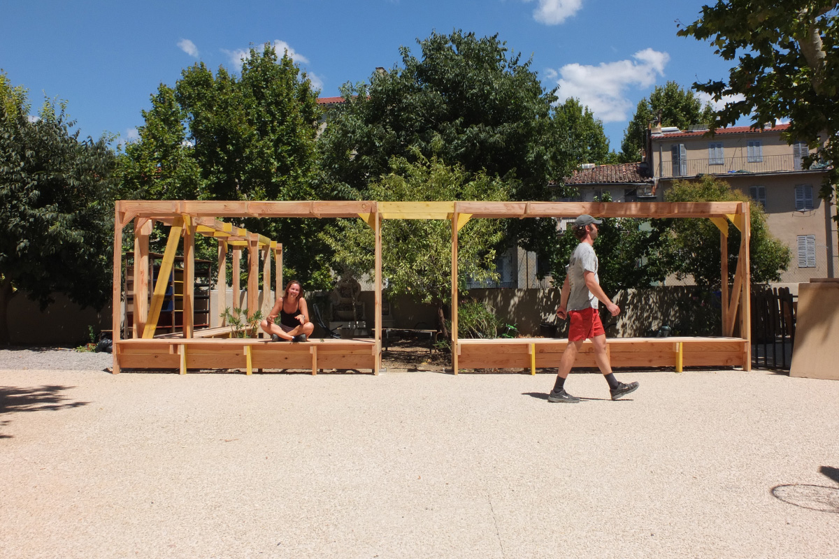 “La Source is a place of hospitality, support and sharing located in the 3rd arrondissement of Marseille. Following their request, we came up with a design offering a shaded and friendly space, conducive to outdoor activities, socialising and community life. The project was carried out through a participatory process. The foundations were laid on site, the half-timbered joints were hand-cut, and the structure was assembled in a convivial atmosphere. The project concluded with a festive barbecue to celebrate the installation of the new Pergola!