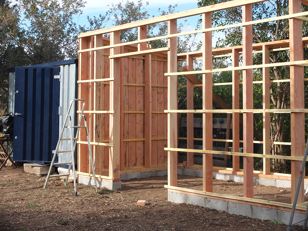 En collaboration avec l’équipe de la Bastide, nous prévoyons la création d’un espace couvert afin de garantir le confort des usager·es lors des journées de pluie ou de fortes chaleurs. Une structure simple, reposant sur des fondations cyclopéennes, porte une toiture qui protège une petite cuisine extérieure permettant les usages du quotidien (se laver les mains, rincer de la vaisselle, préparer un repas partagé) et un espace fermé pour augmenter le stockage et avoir un petit vestiaire. Une seconde partie de la toiture sert de support à une treille de vigne, apportant à terme ombre et fraîcheur. La structure intègre également un long banc favorisant l’accueil collectif.