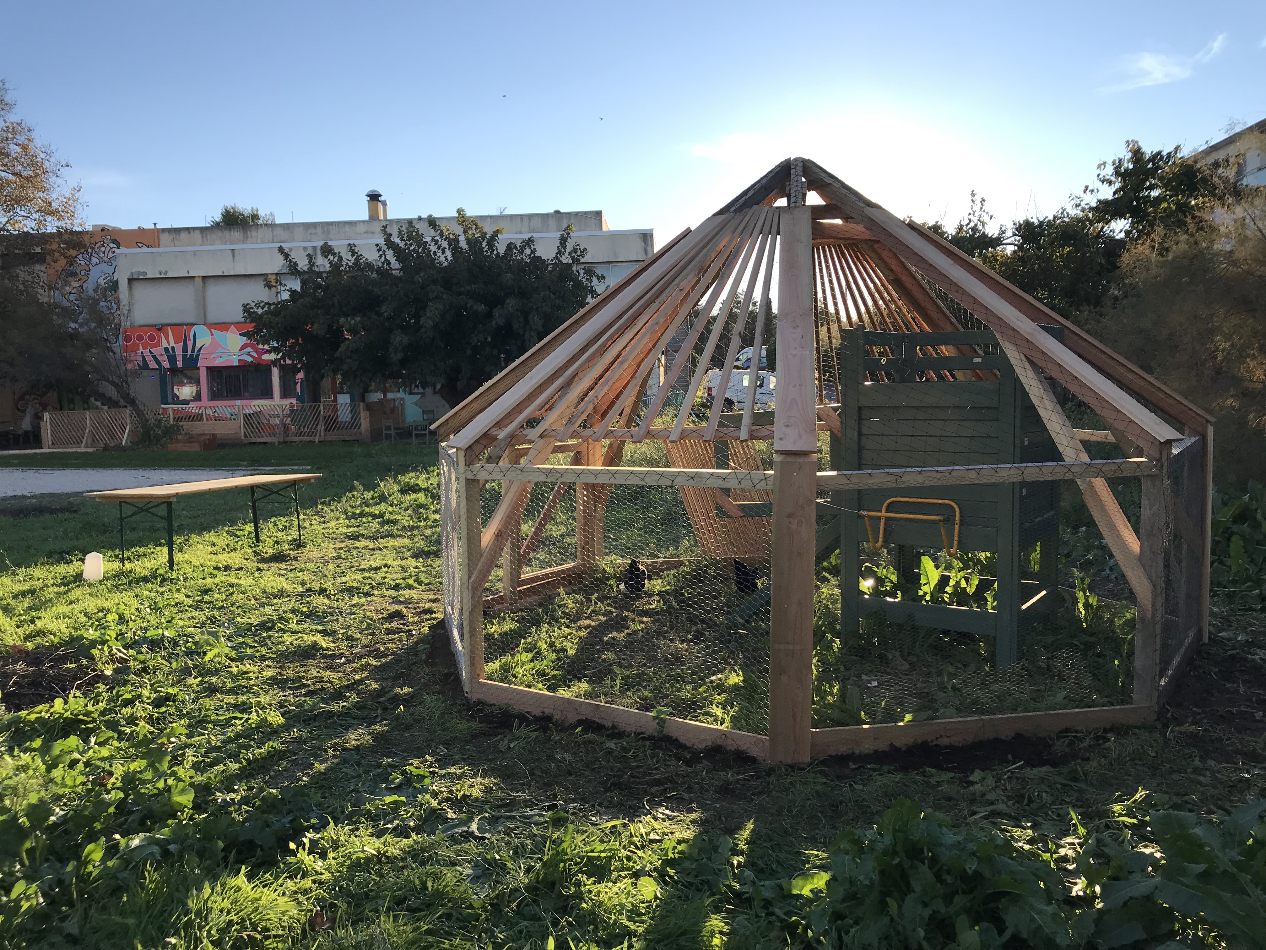 Effectivement, ces dernières attendent un habitat où elles pourront profiter des joies du jardin de manière paisible. Et, comme chaque jour de la vie d’une poule est une fête, l’équipe de Terrains Vagues revisite la thématique du chapiteau à travers celle du poulailler afin de créer une nouvelle typologie d’habitat, à la fois festive et utile.